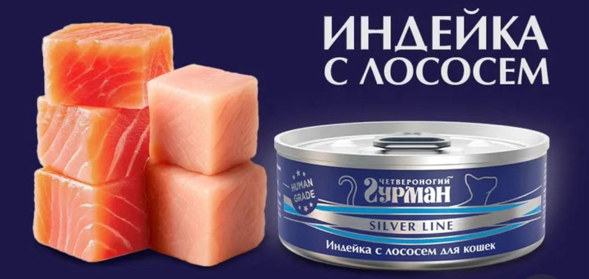 ЧЕТВЕРОНОГИЙ ГУРМАН Silver Консервы для кошек индейка с лососем 100г