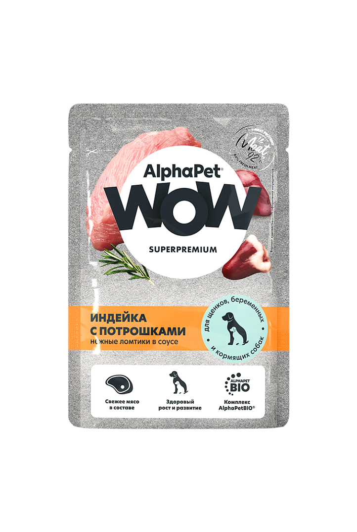 АЛЬФАПЕТ WOW пауч для щенков, беременных и кормящих собак Индейка с потрошками нежные ломтики в соусе 85г