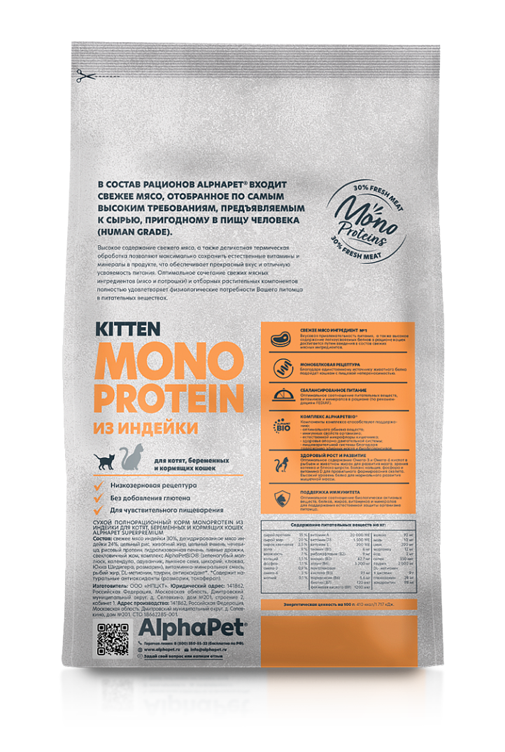 556 ₽АЛЬФАПЕТ SUPERPREMIUM MONOPROTEIN Сухой полнорационный корм для котят, беременных и кормящих кошек из индейки