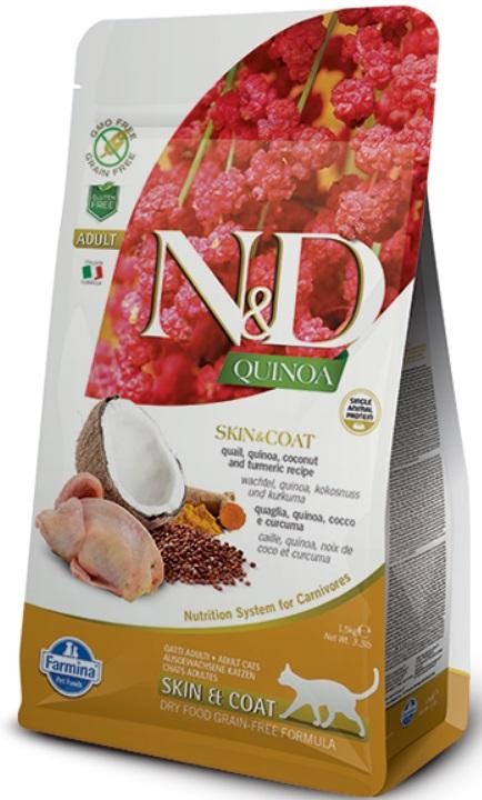 ФАРМИНА N&D Cat Quinoa Skin&coat Quail сухой беззерновой корм для взрослых кошек Перепелка c киноа, кокосом и куркумой