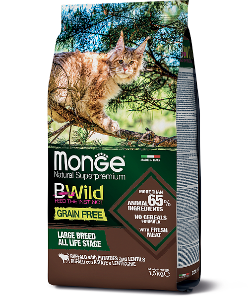 Monge BWild Cat GRAIN FREE - это инновационная линейка для кошек крупных пород всех возрастов, созданная компанией Monge для того, чтобы кормить питомцев так, как им "предназначено природой".