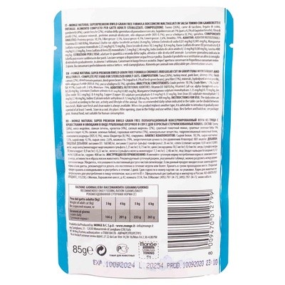 МОНЖ NATURAL CAT пауч BWILD GRAIN FREE для стерилизованных кошек Тунец с креветками и овощами