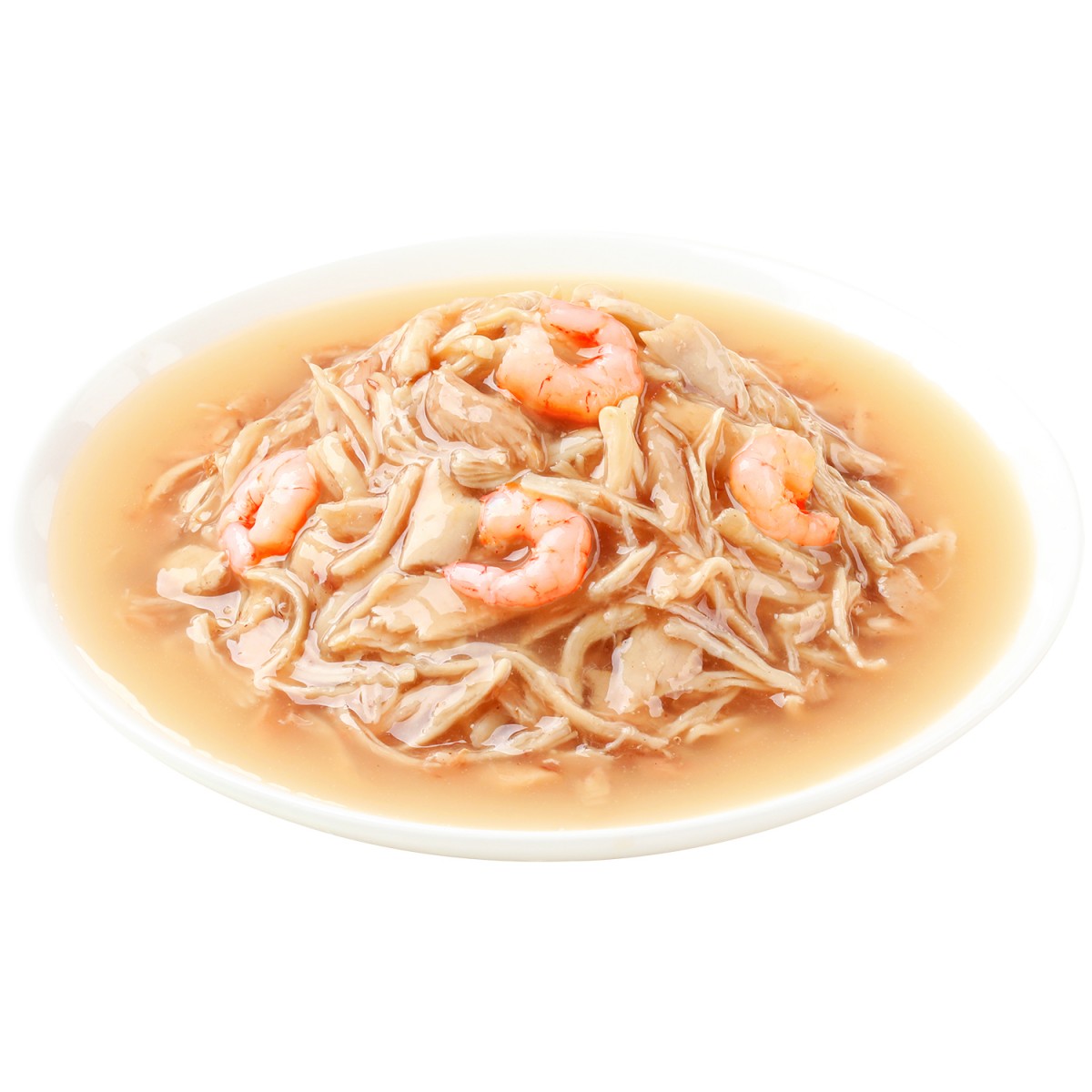 Состав: тунец (43,4 %), курица (40%), креветки (7 %), рыбий жир (1%), крахмал, гуаровая камедь, соль, таурин, лизин,витамины (A, D3, E, B1, B2, B6, C, D-биотин, D-пантотеновая кислота, фолиевая кислота, ниацинамид).