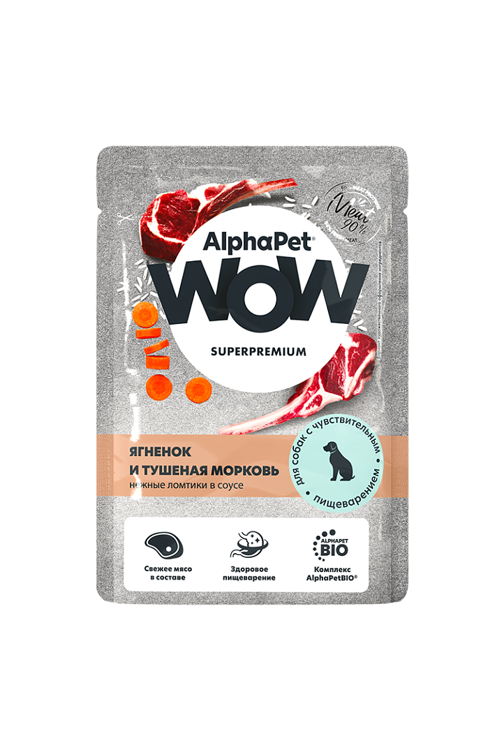 АЛЬФАПЕТ WOW пауч для собак с чувствительным пищеварением Ягненок и тушеная морковь нежные ломтики в соусе 85г