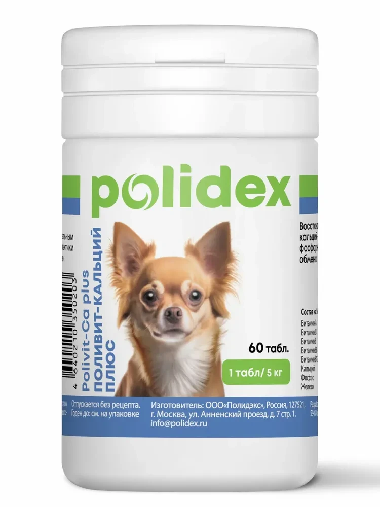 ПОЛИДЕКС (POLIDEX) Polivit-Ca plus Поливит кальций плюс витамины для поддержания здоровья и укрепления костей у собак (1таб/5кг) 60 таб